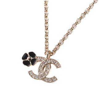 Elevate your style with this exquisite crystal-embellished pendant necklace from CHANEL. The iconic double-C logo pendant sparkles brilliantly with precisely set clear crystals, creating an eye-catching centerpiece. Adding a unique touch, a delicate black enamel flower accent provides sophisticated contrast against the silver-toned setting. The pendant is suspended from a coordinating silver-toned chain with a classic rolo link design that offers both durability and elegance. This versatile piece strikes the perfect balance between timeless luxury and contemporary charm, making it an ideal accessory for both special occasions and everyday wear. The necklace showcases CHANEL's renowned attention to detail and masterful craftsmanship, evident in every facet of its design. Whether paired with evening wear or used to add a touch of glamour to casual attire, this necklace makes a refined statement of sophisticated style.